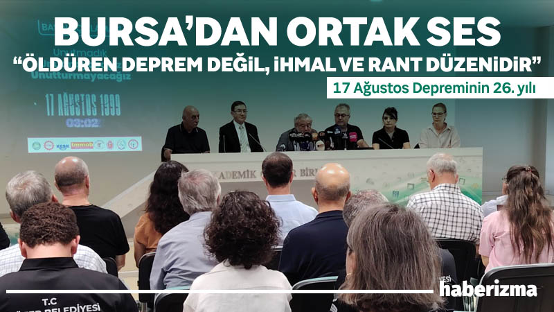 17 Ağustos 1999 Marmara Depremi’nin 26. yıldönümünde, Bursa’da bir dizi meslek örgütü ve demokratik kitle kuruluşu ortak basın açıklamasıyla bir araya geldi. Bursa Barosu, Bursa Eczacı Odası, Bursa Kent Konseyi, Bursa Tabip Odası, Bursa Veteriner Hekimleri Odası, DİSK, KESK ve TMMOB Bursa İl Koordinasyon Kurulu tarafından düzenlenen açıklama, 15 Ağustos 2025 Cuma günü BAOB Ortak Salon’da gerçekleştirildi. Açıklamayı TMMOB Bursa İKK Sekreteri Murat Korkut okudu.