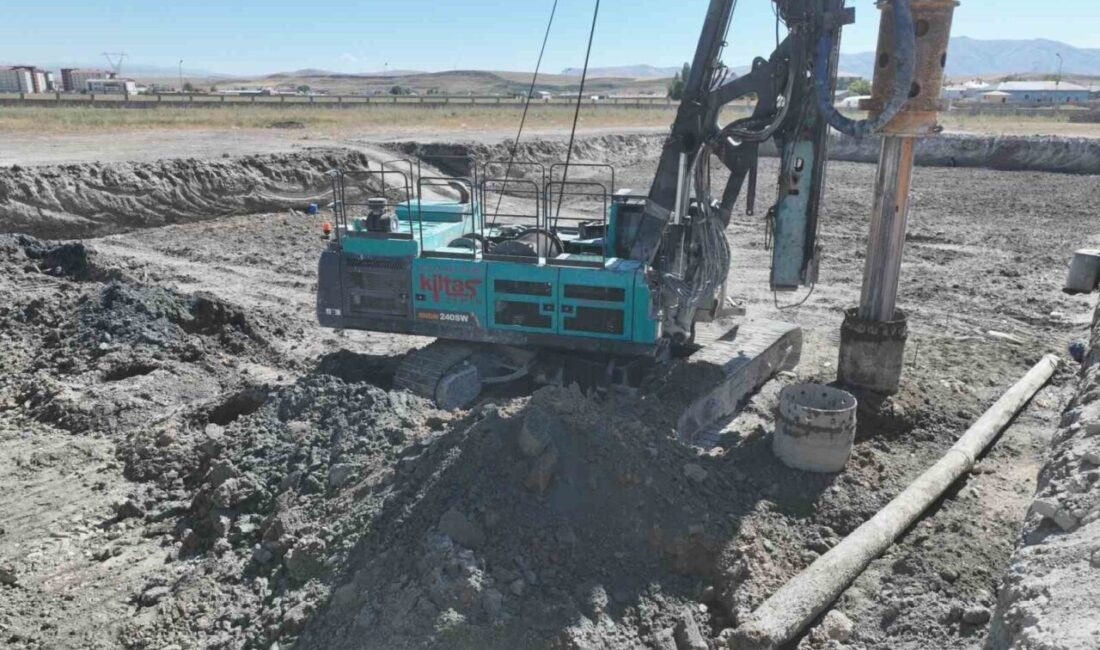 Ağrı İl Özel İdaresi tarafından yapımına başlanan yeni hizmet binasında temel kazısı tamamlanırken, zemin iyileştirme çalışmaları fore kazık uygulamasıyla sürüyor.