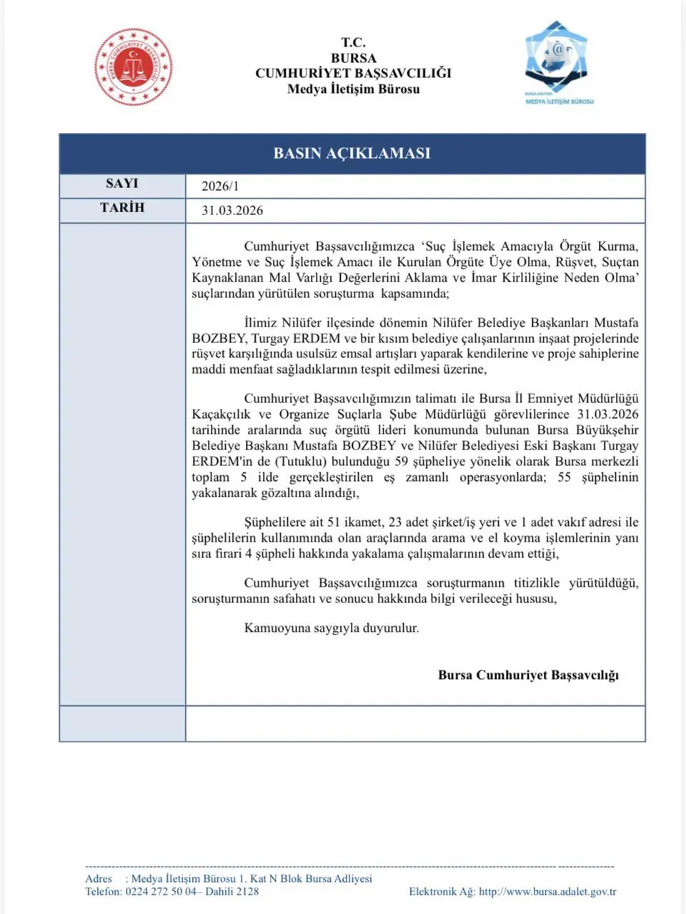 Açıklamada, şunlar kaydedildi: “Cumhuriyet Başsavcılığımızın talimatı ile Bursa İl Emniyet Müdürlüğü Kaçakçılık ve Organize Suçlarla Şube Müdürlüğü görevlilerince 31 Mart 2026’da aralarında suç örgütü lideri konumunda bulunan Bursa Büyükşehir Belediye Başkanı Mustafa Bozbey ve Nilüfer Belediyesi Eski Başkanı Turgay Erdem’in de (tutuklu) bulunduğu 59 şüpheliye yönelik olarak Bursa merkezli toplam 5 ilde gerçekleştirilen eş zamanlı operasyonlarda 55 şüphelinin yakalanarak gözaltına alındığı, şüphelilere ait 51 ikamet, 23 adet şirket/iş yeri ve 1 adet vakıf adresi ile şüphelilerin kullanımında olan araçlarında arama ve el koyma işlemlerinin yanı sıra firari 4 şüpheli hakkında yakalama çalışmalarının devam ettiği, Cumhuriyet Başsavcılığımızca soruşturmanın titizlikle yürütüldüğü, soruşturmanın safahatı ve sonucu hakkında bilgi verileceği hususu, kamuoyuna saygıyla duyurulur”.