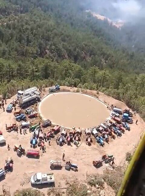 Yangına hem havadan hem de karadan müdahale edilirken, en çarpıcı görüntülerden biri helikopterden kaydedildi. Helikopter su almak için alçaldığı sırada havuzun etrafında sıralanmış yüzlerce yangın söndürme tankeri dikkat çekti. Ancak havuzdaki su tükenince tankerler bu kez helikopterlere su taşıma görevini üstlendi. Onlarca tanker havuzu yeniden doldurarak helikopterlerin kesintisiz çalışmasına destek verdi. Çiftçilerin oluşturduğu traktörlü tanker ordusu ise, söndürme helikopterinden görüntülendi.
