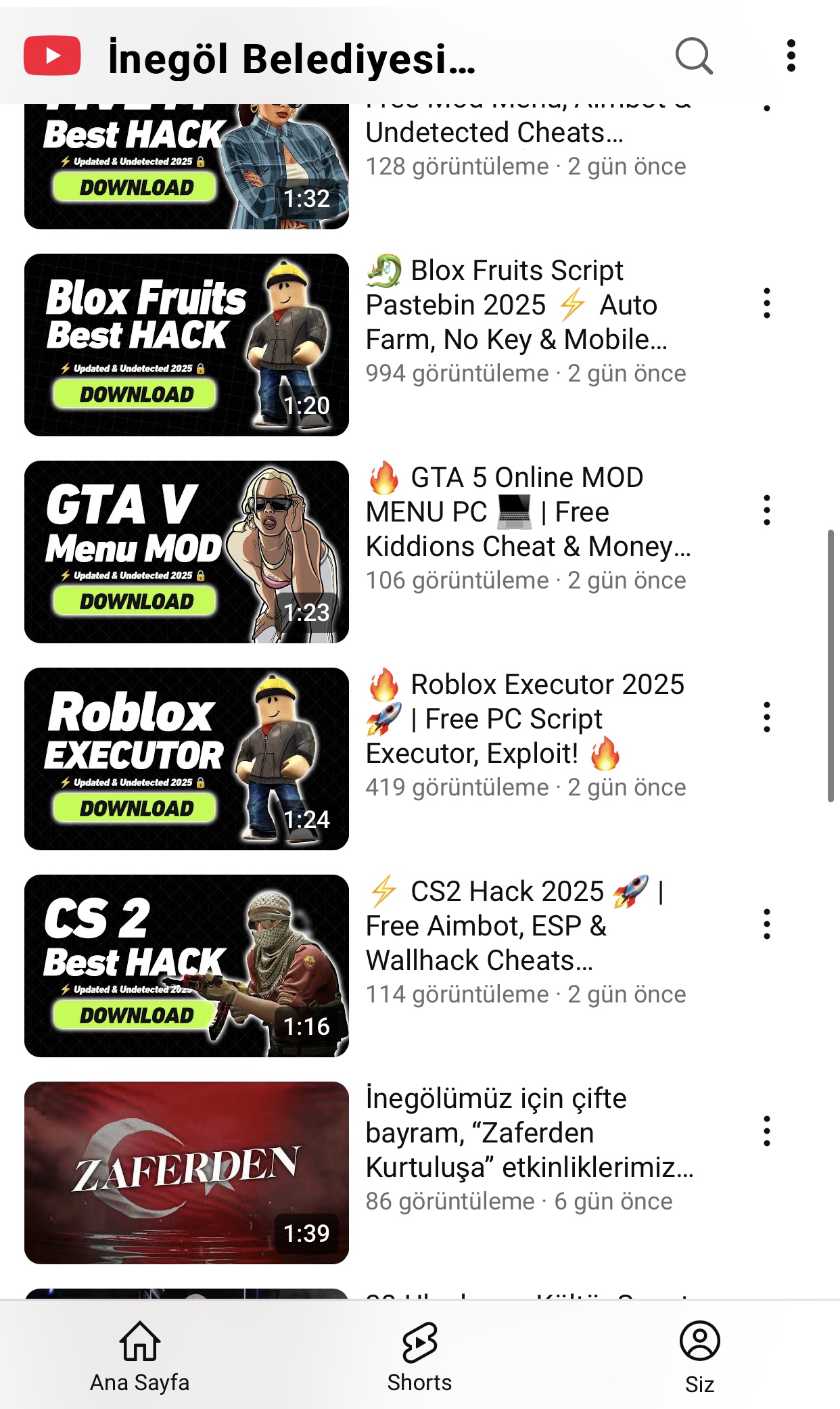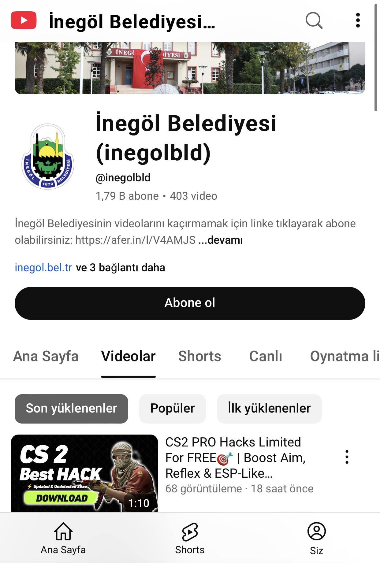 Kanalda son 24 saat içinde belediyeyle hiçbir ilgisi bulunmayan, “CS2 PRO Hacks Limited For FREE🎯 | Boost Aim, Reflex & ESP-Like Awareness” başlığıyla oyun hilelerini tanıtan 14 video yüklendi.