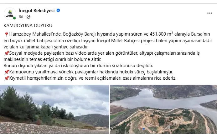 İnegöl Belediyesi, kamuoyuna yaptığı duyuruda şu ifadelere yer verdi:
