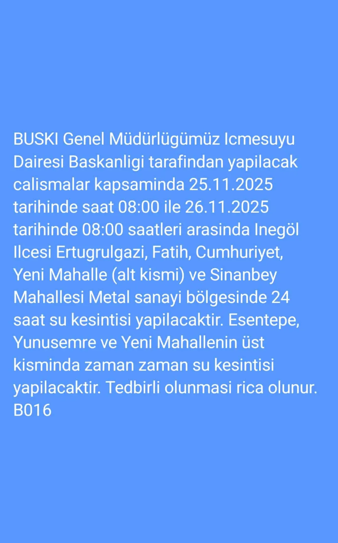 Kesinti 25 Kasım 2025 tarihinde saat 08.00’de başlayacak ve 26 Kasım 2025 tarihinde saat 08.00’de sona erecek. Toplam 24 saat sürecek kesintiden Ertuğrulgazi, Fatih, Cumhuriyet, Yeni Mahalle’nin alt kısmı ile Sinanbey Mahallesi Metal Sanayi bölgesi etkilenecek.