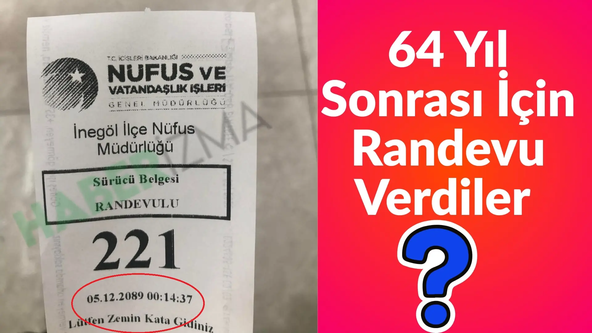 Ehliyeti üzerinde değişiklik yapılması için İnegöl Nüfus Müdürlüğüne yapılan müracaatta 64 yıl sonrasına randevu verildi.