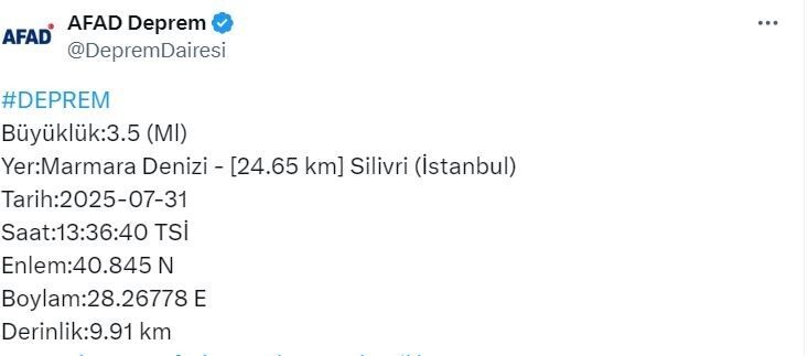 İstanbul’un Silivri açıklarında 3,5 büyüklüğünde bir deprem meydana geldi.