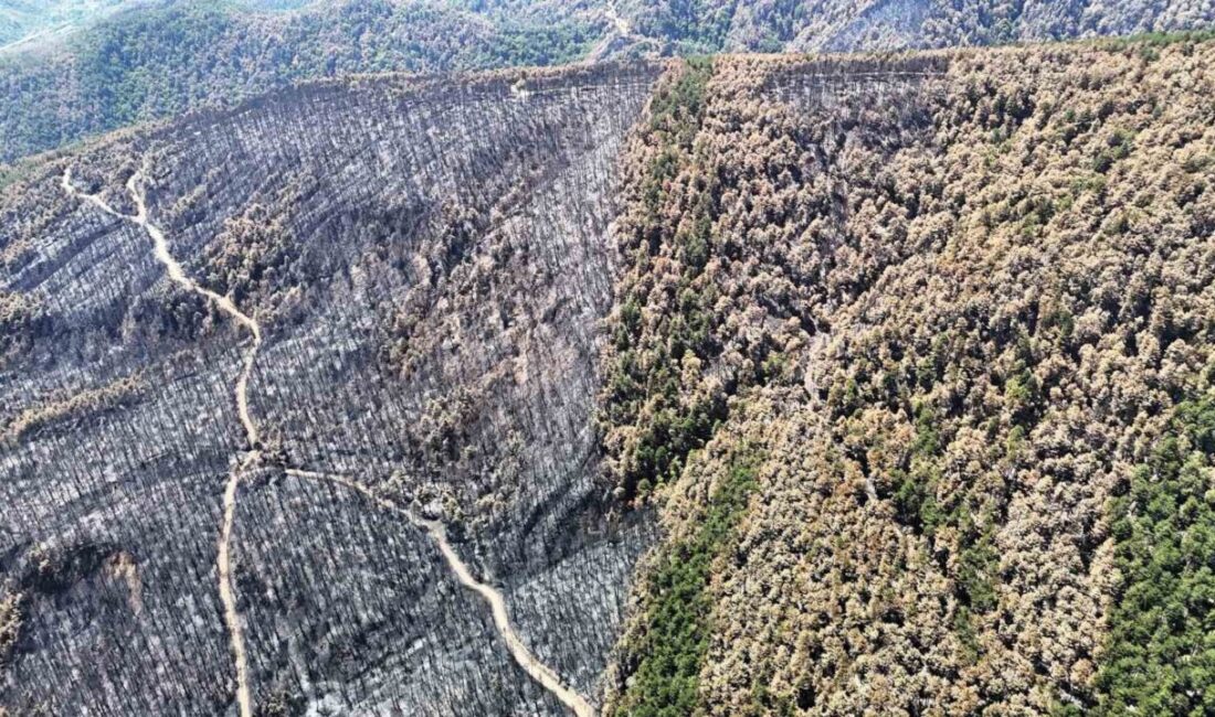 Dronla kaydedilen görüntülerde, yeşilin canlılığını kaybettiği, yer yer tamamen siyaha dönen alanların geniş bir coğrafyaya yayıldığı tespit edildi. Özellikle sararan ağaç yaprakları, kuruyan fidanlar ve is tutmuş topraklar, yangının doğaya verdiği zararı gözler önüne serdi.