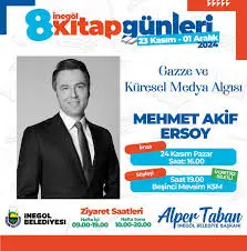 İnegöl Belediyesi geçtiğimiz yıl 8. kez düzenlediği İnegöl Kitap Günleri kapsamında “Gazze ve Küresel Medya Algısı” başlıklı söyleşiye Habertürk Televizyonu Genel Yayın Yönetmeni Mehmet Akif Ersoy’u davet etmişti.