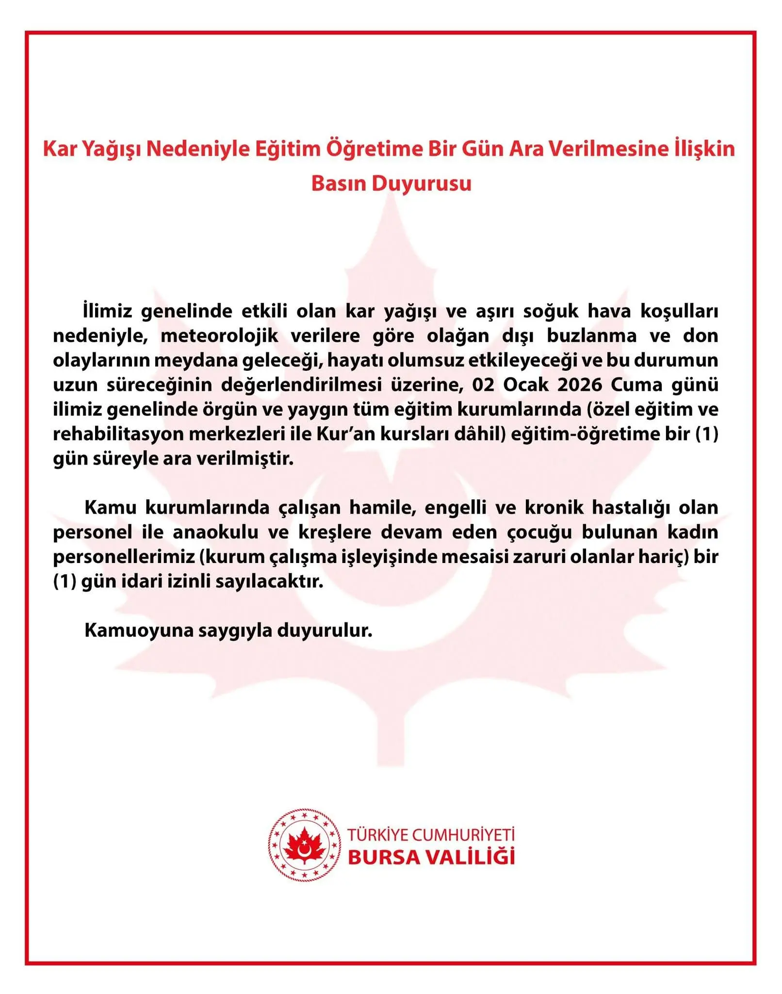 Bursa Valiliğinden yapılan açıklamayla Bursa merkez ve ilçelerinde ki okullarda eğitim ve öğretime 1 gün kar tatili verildi.