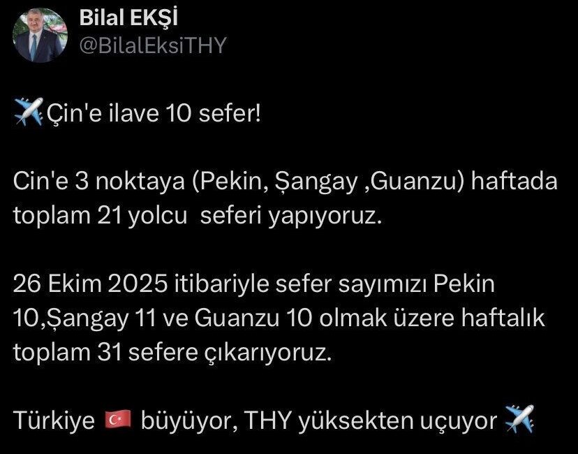 Konuyla ilgili olarak sosyal medya hesabı üzerinden açıklama yapan THY Genel Müdürü Bilal Ekşi, “Çin’e ilave 10 sefer! Cin’e 3 noktaya (Pekin, Şangay, Guanzu) haftada toplam 21 yolcu seferi yapıyoruz. 26 Ekim 2025 itibariyle sefer sayımızı Pekin 10, Şangay 11 ve Guanzu 10 olmak üzere haftalık toplam 31 sefere çıkarıyoruz. Türkiye büyüyor, THY yüksekten uçuyor” dedi.